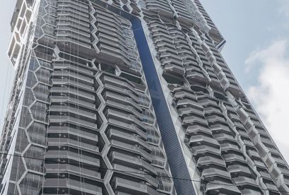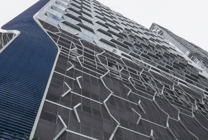 مشروع زخرفة الجدار الخارجي تم تنفيذه من قبل شركة قوانغتشو Jianghe Curtain Wall System Engineering Co., Ltd.، وتم توفير شبكة زخرفة الجدار الستاري من قبل Ares.